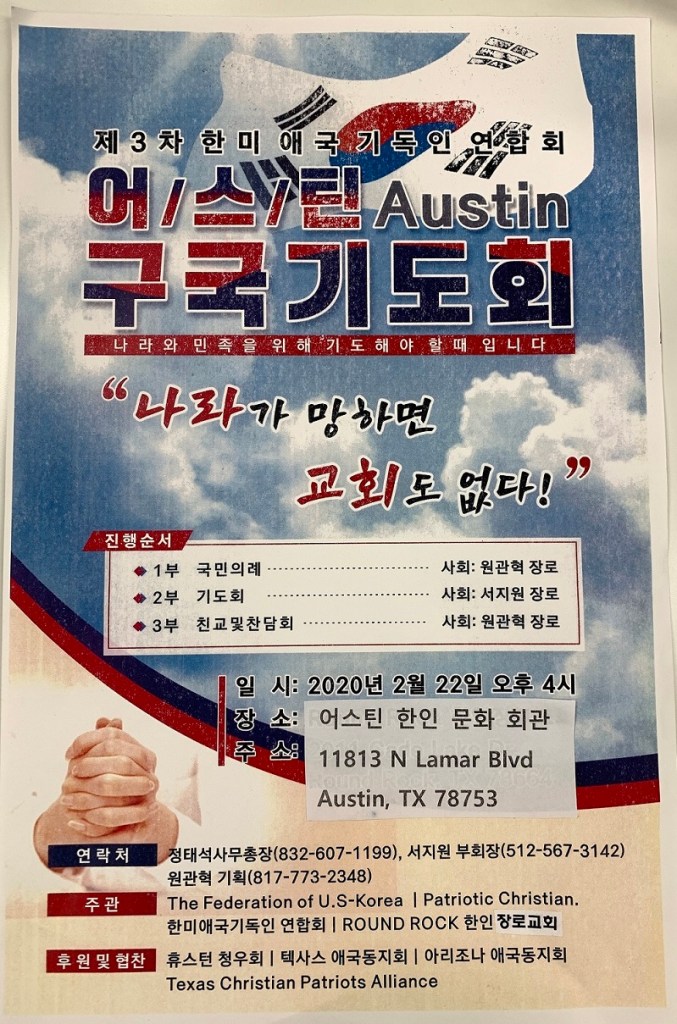 오스틴 구국 기도회 2월 19, 20202월 19, 2020 한미 애국기독인 연합회가 주관하는 오스틴 구국 기도회가 2020년 2월 22일 토요일 오후 4시에 한인 문화회관에서 열립니다. 많은 참여 바랍니다. 글쓴이: 이 정희 이 정희의 모든 글 보기